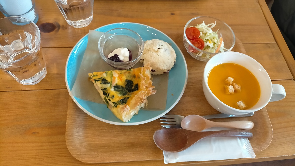 キッシュとスコーン、かぼちゃのスープ、コールスロー、