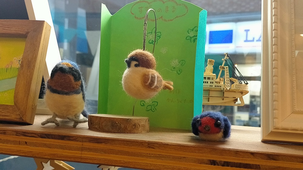 窓際には、まんまるなスズメと、平べったいツバメ、立ち姿のツバメが。