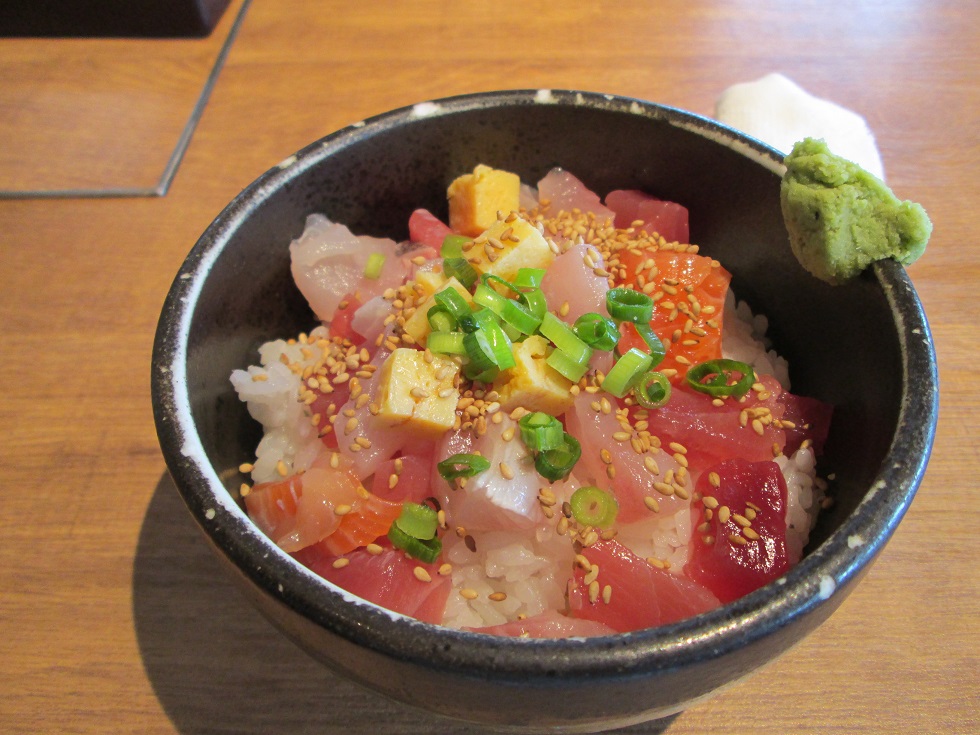こちら、写真の”沼津港”の提灯横のお店「浜焼きしんちゃん」の海鮮丼¥580なり。